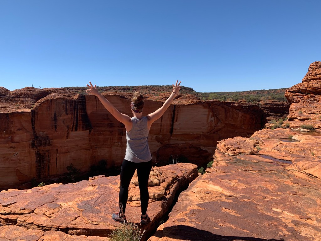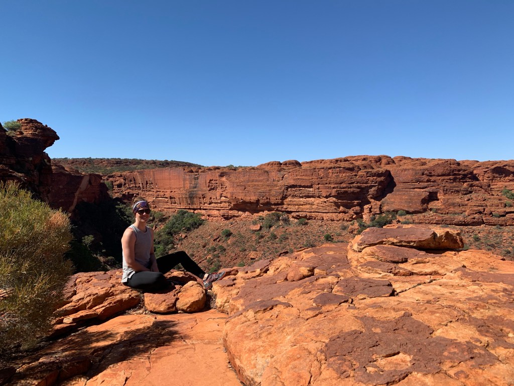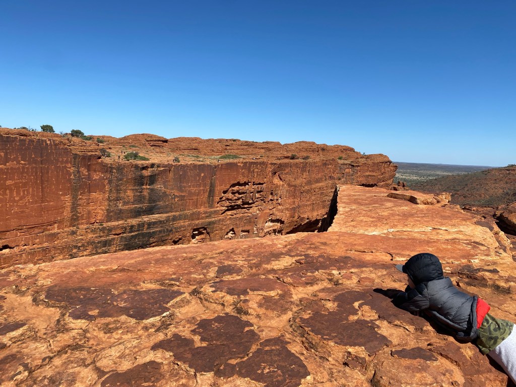 As we neared Kings Canyon, we pulled in to Ginty’s lookout. At the time I thought this was the end of the dirt road… it was not. So we pumped our tyres back up only to learn we had another 10-15kms of corrugations to go. It’s be honest, the difference was negligible. The view from Ginty’s however, was pretty great. I’ve discovered that big rocks are like new born babies. I could just stare at them all day, watching the sunlight caress them and following how their colours transform; it’s mesmerising. Looking at Kings Canyon from this lookout and taking its significance, it’s difficult to fathom that Uluṟu is more than twice as high and over three times as long.
