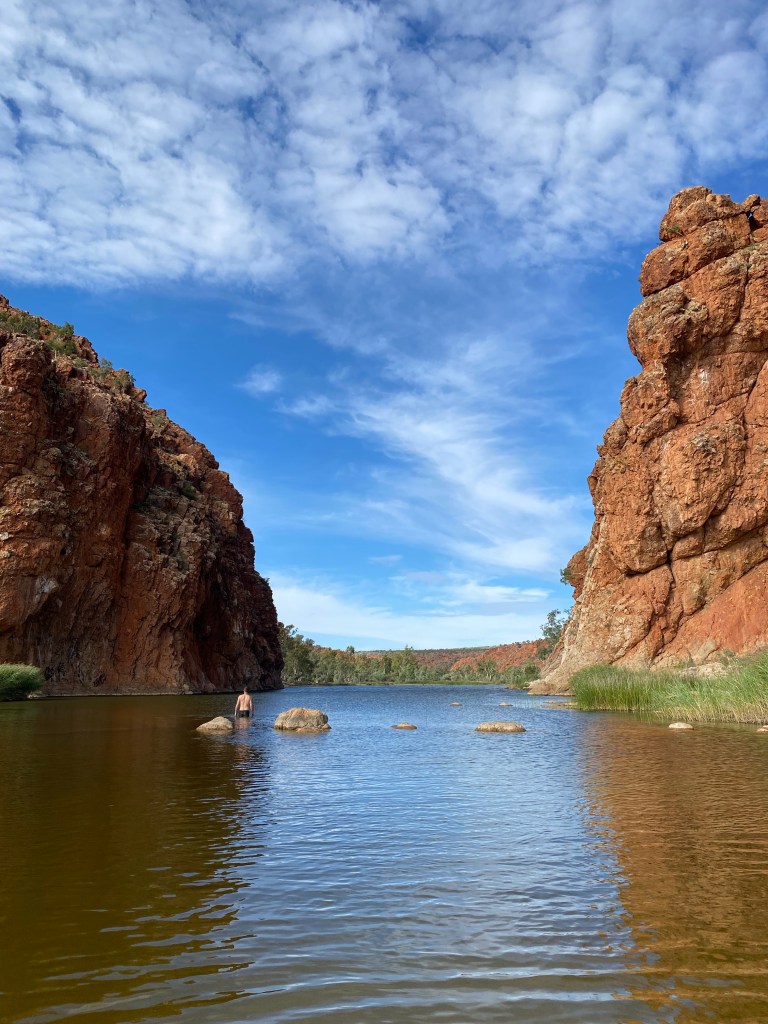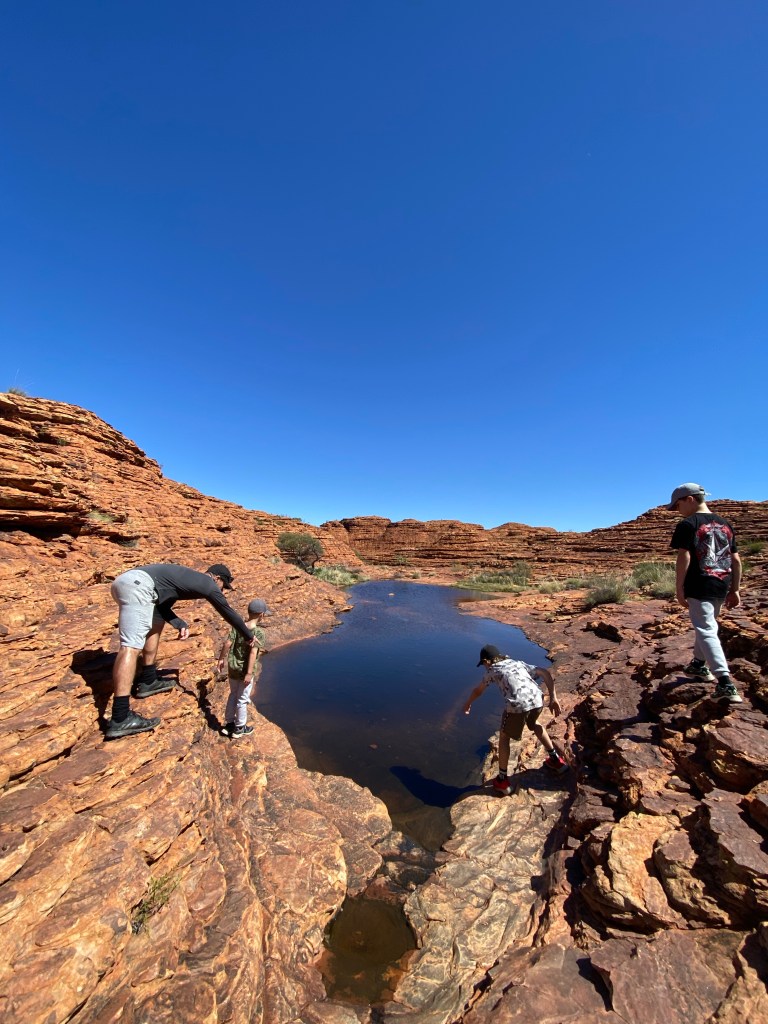 On our way to the beginning of the dirt road we needed to stop in at Glen Helen to purchase a permit to travel across the Aboriginal lands between Katapata Pass and Watarrka National Park. Glen Helen was a very well resourced caravan park. Complete with bar and restaurant and very tidy ammenities. I was glad we hadn’t continued on to stay here rather than Ormiston Gorge. While I appreciate a laundry every now and then, and a shower where I can keep my feet clean, when I’m in the middle of nowhere, I like to feel like I’m in the middle of no where. In addition, while Glen Helen Gorge is beautiful, it pales in comparison to Ormiston. While we were here we purchased our permit and walked down to the gorge. Leon was the only one prepared for a swim so he enjoyed the deep water of the gorge while the kids and I watched from the edges. It was here that we had our first snake sighting. I don’t know what type of snake she was, and she didn’t hang around for long, but she was beautiful.
