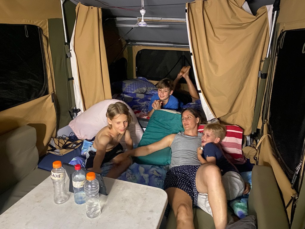 Rain rain rain. The forecast was spot on. We arrived and set up camp. We didn’t bother with the gazebo as we didn’t want to worry about securing it for the potential storm. Rather we set the table and chairs up inside for the first time this trip. It got cold as soon as it was dark and the Macpac jackets made an appearance. The rain began late in the evening and was pretty constant for the next 15 hours. Our first night and the following day were spent hulled up in the camper. We were grateful for the diesel heater. In the afternoon the rain slowed to a drizzle and we thought we might get in the creek walk. Off we went only to discover that not only were the National Park walks closed, but the road out of the park was too! Back to the camper we headed.