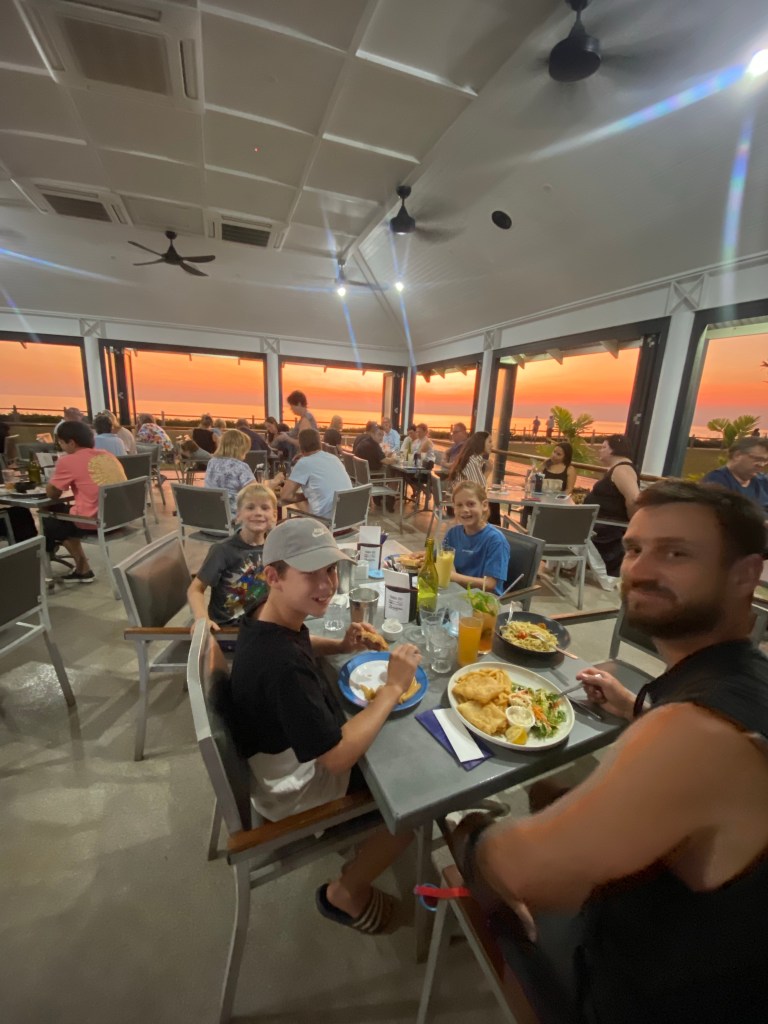 After the swim we jumped in the car and headed to Cable Beach to have some diner and drinks and catch the sunset. The boys were upset they didn’t get to experience the Broome skatepark because it looked pretty epic as we drove by. We arrived at Zander’s and asked for a table, which they arranged while we stood atop the hill and watch the sun descend and paint the sky. We watched those on camel rides stroll past the stairway along the water designed by the sun. We watched people play embracing the carefree holiday feel of the place, and as such the lure of cocktails at Zander’s was strong. We enjoyed a lovely dinner with a few drinks, and continued to enjoy the sunset that just kept on giving.