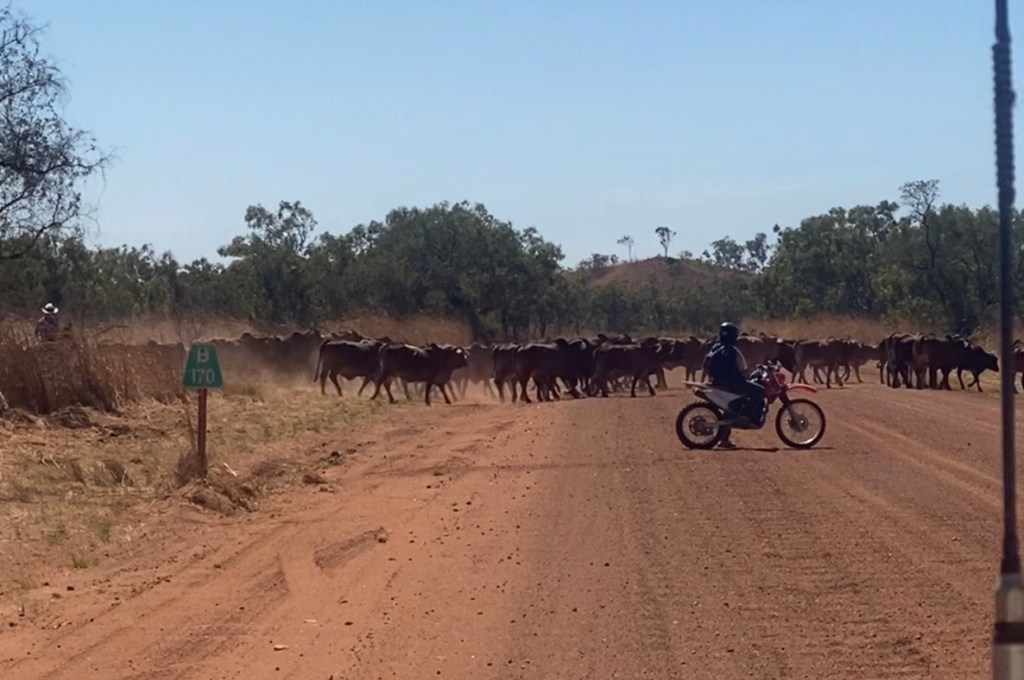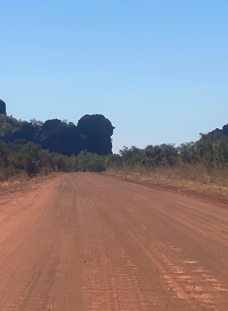 The road began to deteriorate at the Mt Hart turn off, mildly. We could still maintain between 50 and 80km depending on the particular stretch of road. There was distinct black strokes embedded in the rock that often towered alongside the road, that was different to the rocks we’ve seen elsewhere. There were also little pockets of tropical forestry, like tiny little rainforests accenting the sometimes baron land. We were stopped by a group of ringers in motorbikes and horses mustering some cattle across the road, the kids thought that was cool.