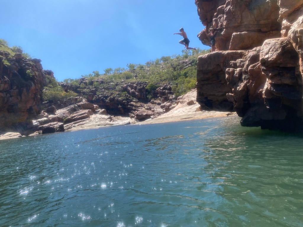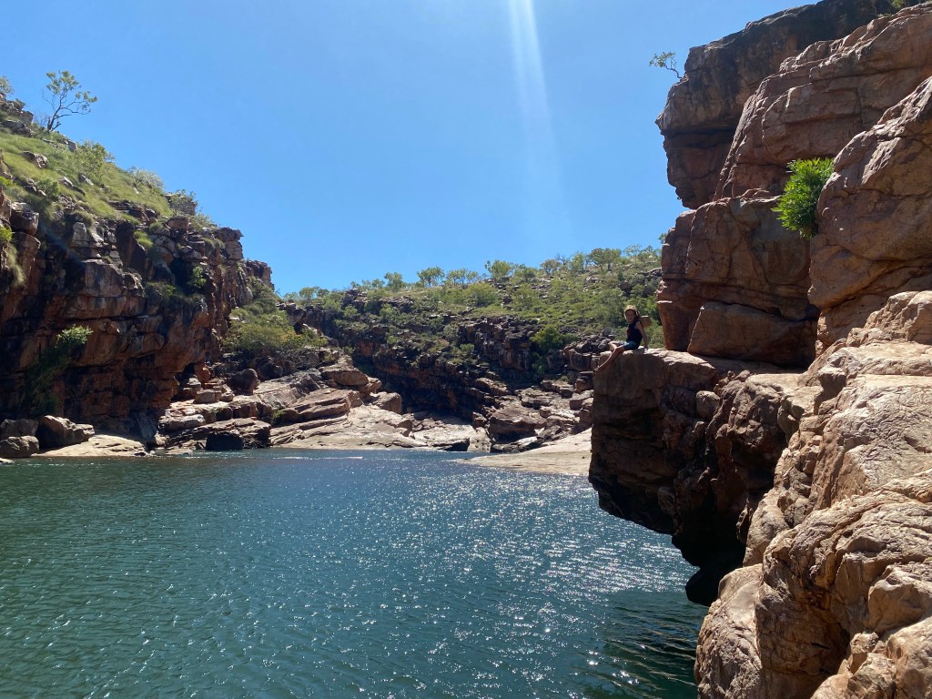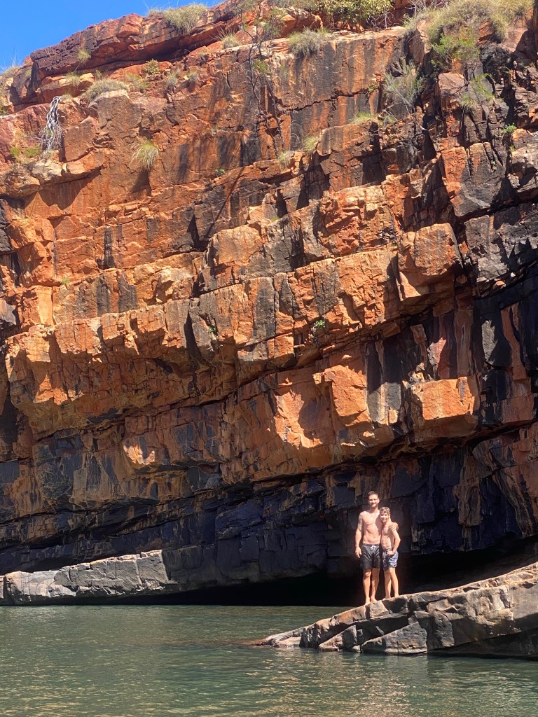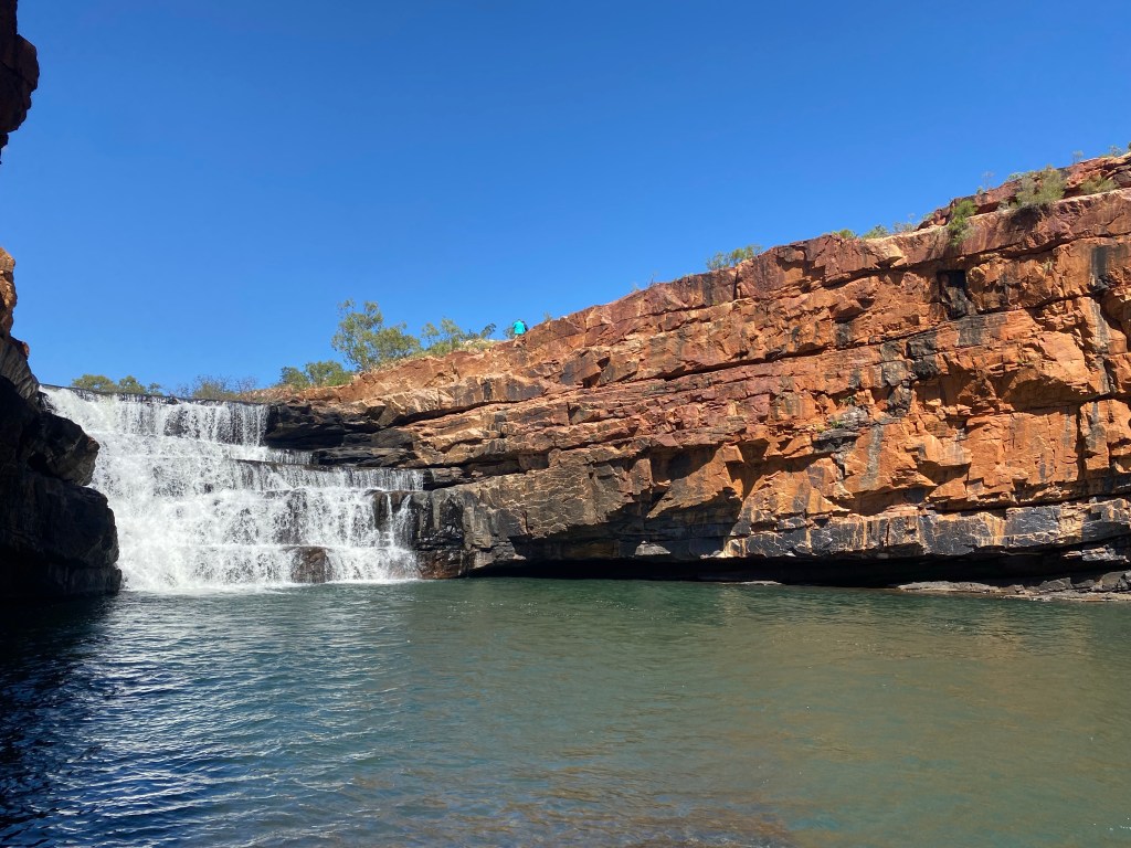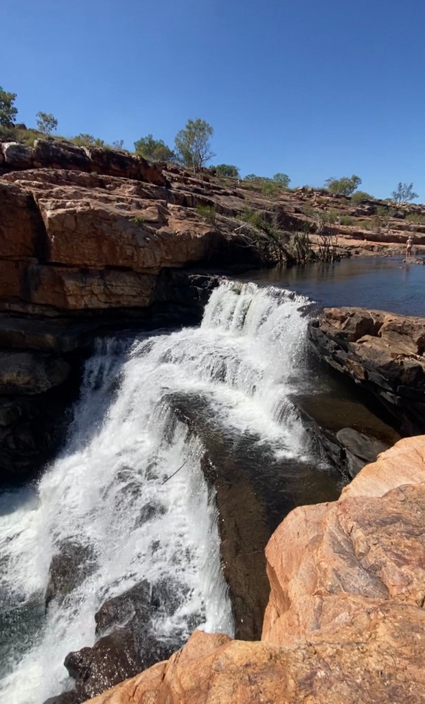 We made our way down the steepish track to the bottom of the waterfall which was very straight forward and all kids did completely independently and did not heighten my nerves at all. The waterfall was grand. Water thundering down a giant five tiered staircase, landing in a large deep plunge pool boarded by tall rock walls with the red and black that I’m learning is indicative of the Kimberley. The water is not the gemstone green of Karijini, but rather the crystal clear of natural springs and streams.