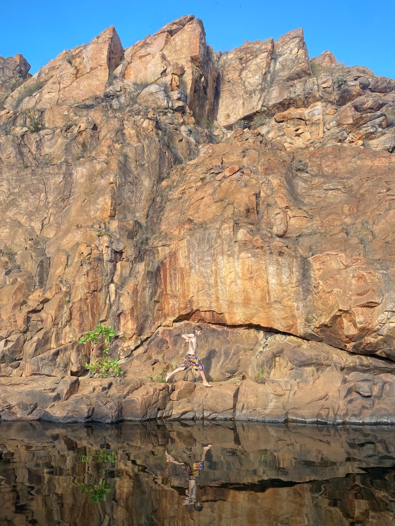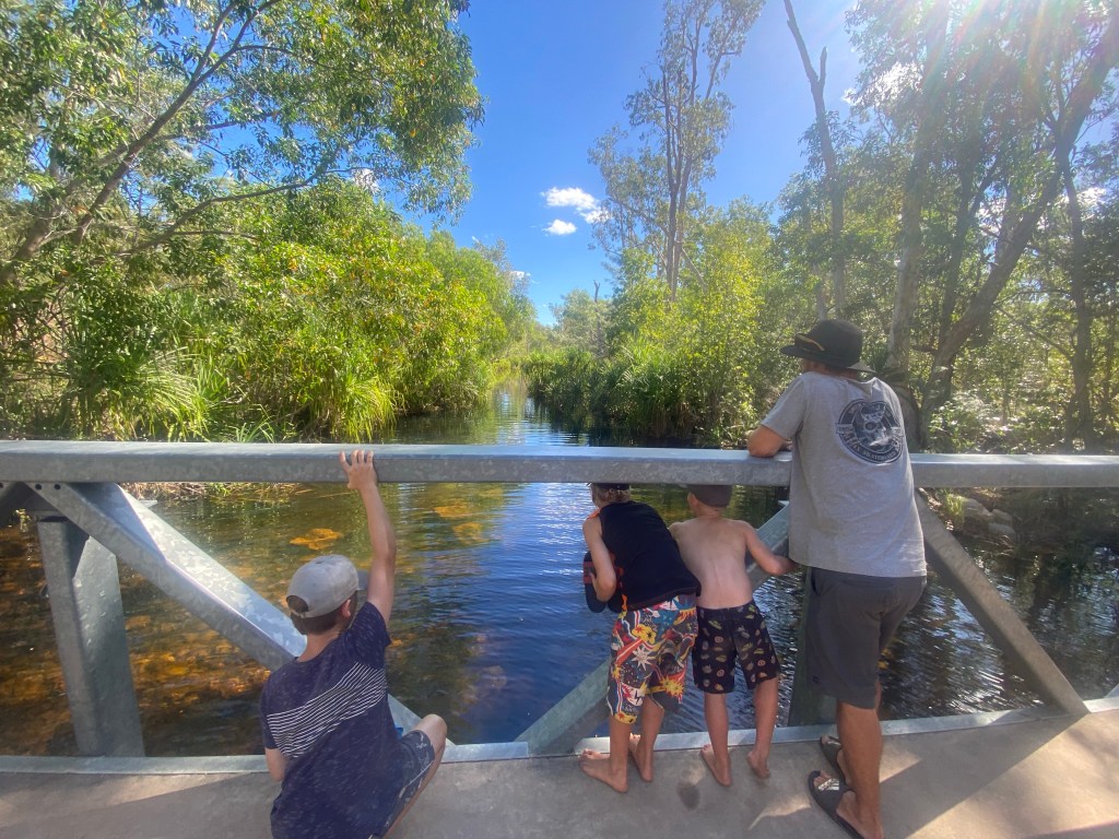 We headed back to camp and embarked on the Edith Falls walk. It’s not a long walk, but it was hot. The kids weren’t feeling well, particularly Malachi. Perhaps he still hasn’t recovered from whatever hit him at Big Horse. However, when we made it to the top pool at Edith, all their ailments seemed to disappear. The RJs were here. They were about to leave but our arrival threw a spanner in those plans! Elsie, Harriet and Charlie showed our kids how to use the current to propel them through a channel. They could have done this all afternoon.