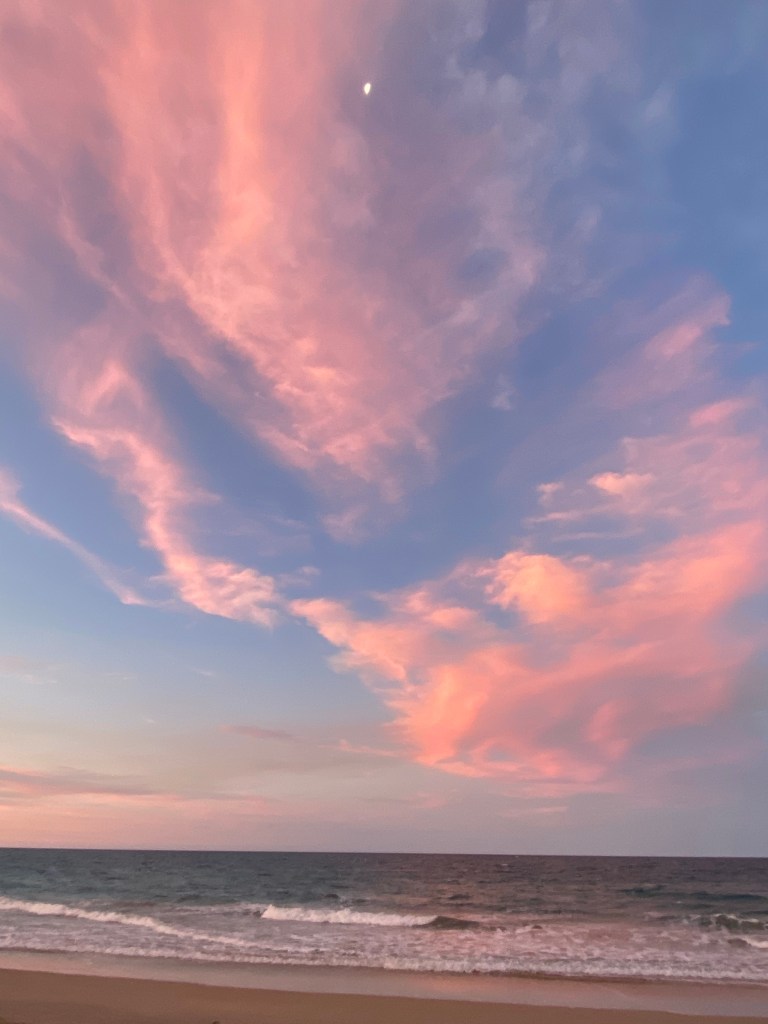 The wind subsided as the sun set, and wisps of pink cloud danced in the sky above the ocean, and the family enjoyed dinner around the table outside listening to the waves rhythmically crashing on the sand. I went to bed grateful for the calm, the rest, and the empty to do list. Soaking up as much of it as I can before returning to work, committing myself to hanging on to some of it. To ensure continued balance and wellbeing, the ultimate goal of this trip, is achieved.