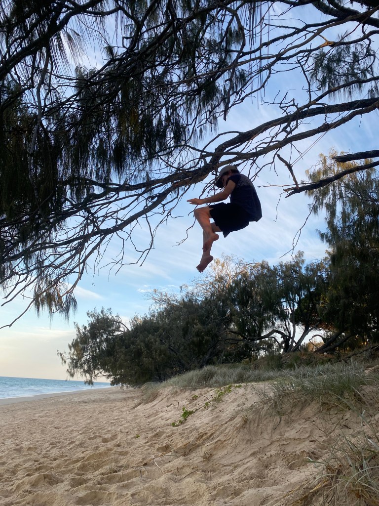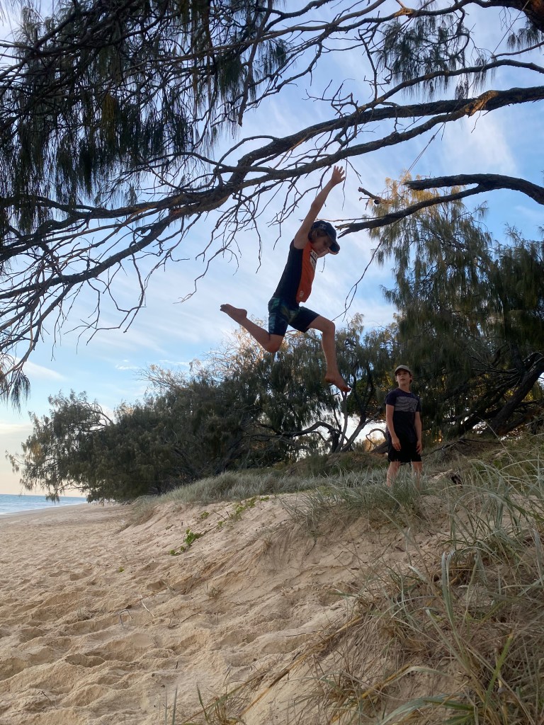 We waved them off in the early afternoon and our kids worked hard to set up a rope swing, inspired by the RJs and a ready placed rope… albeit too high to reach and no timber attached. They persevered but in the end Leon needed to help them finish it off. Afterwards however; they had a great time launching off the sand dunes and swinging out over the beach. I cooked dinner early as I didn’t know what the wind was going to do, and would just heat it up when we were ready to eat.